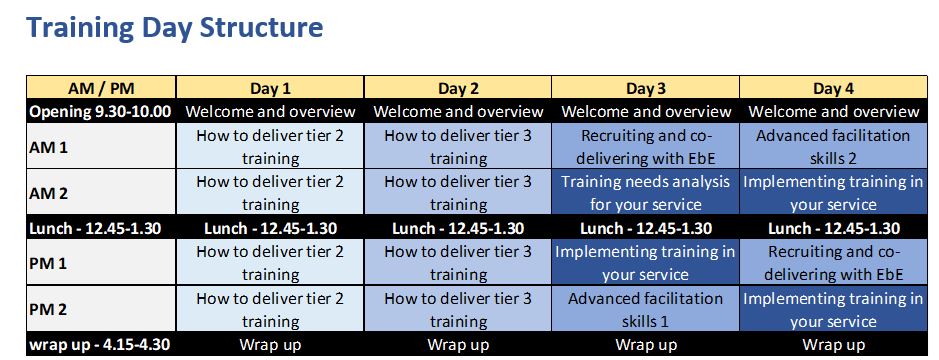 Participants will be required to attend 4 Training Days (training days 1, 2, 3 & 4) to complete the AATtT Training Programme, you must attend all 4 training days to gain certification of completion. To allow participants as much flexibility as possible, you will have the opportunity to chose from 7 different dates for each of the 4 training days (see below table).