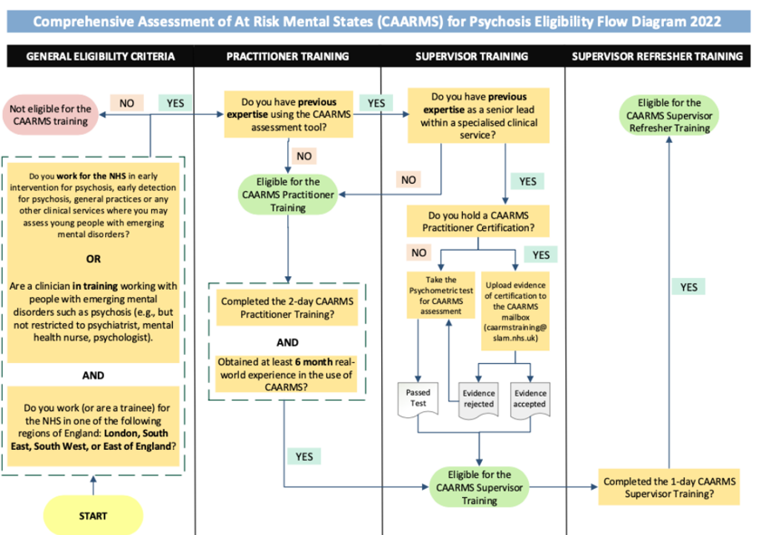 The eligibility criteria for training will be assessed prior to enrolling on the programme. For practitioner training, Maudsley Learning will request that you state if you are working in early intervention for psychosis, early detection for psychosis, general practices or any other clinical services where you may assess young people with emerging mental disorders. For supervisor training, you must have acquired Comprehensive Assessment of At Risk Mental State (CAARMS) practitioner certification (or pass an initial psychometric reliability test) and demonstrate experience as a senior lead within a specialised clinical service. Scores from each application will determine eligibility onto the programme. If you meet the eligibility criteria for supervisor training, please click here for further information.