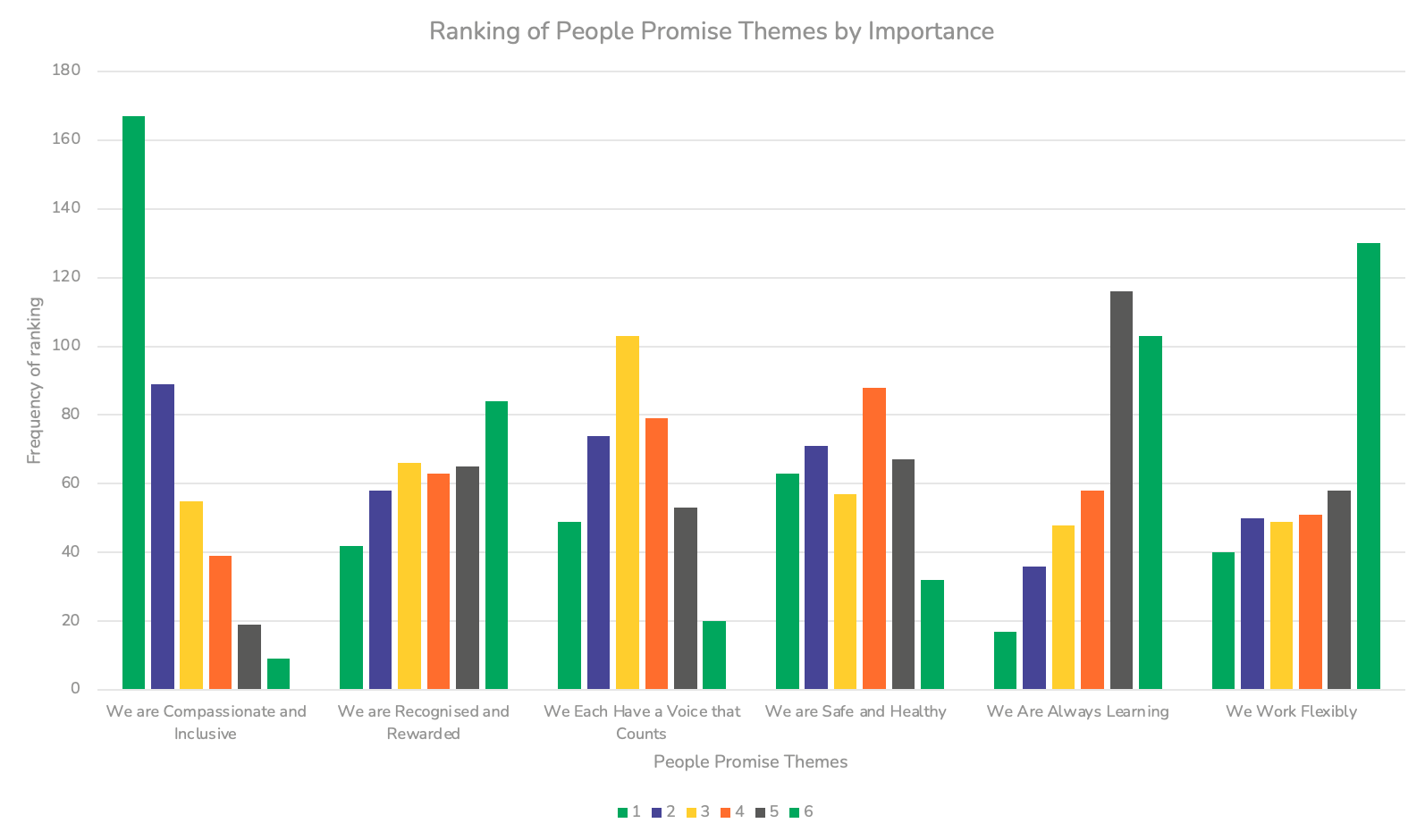 Staff across the participating exemplar sites were asked to rank each of the six People Promise themes focused on as part of the Programme in terms of the personal importance these held. Overall, the theme of ‘We are Compassionate and Inclusive’ was overwhelmingly ranked as the most important theme across sites, with ‘We Work Flexibly’ being the theme that was most consistently ranked sixth1.